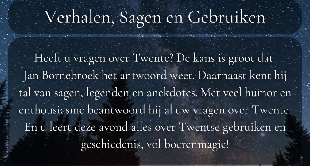 Tijdens deze avond neemt Twente-kenner Jan Bornebroek u mee in de wereld van sagen, legenden en volksverhalen. Hij beantwoord met humor en passie over de “magische” krachten van de natuur en het rijke culturele erfgoed van Twente al uw vragen over Twente. Heb je onderweg een boom of boerderij gezien waar je meer over wilt weten? Vraag het Jan!
