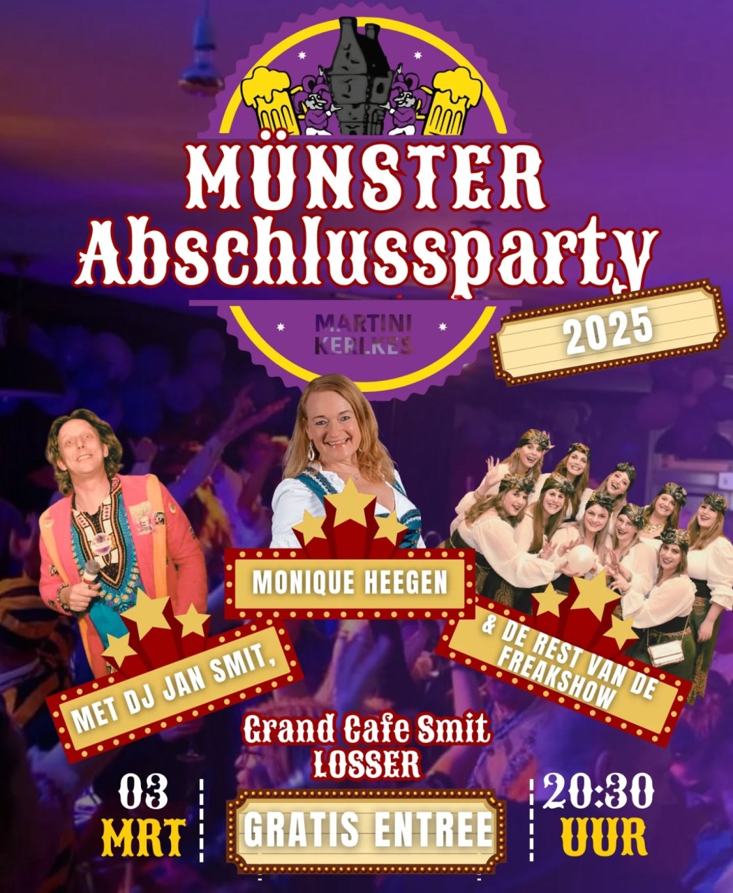 Gezellig carnaval vieren bij Grand CafΓ© Smit op zaterdag 1 maart, maandagavond 3 maart tijdens de Munster Abschlussparty of dinsdag 4 maart tijdens Kindercarnaval. Vrij toegankelijk, geen kaarten nodig.