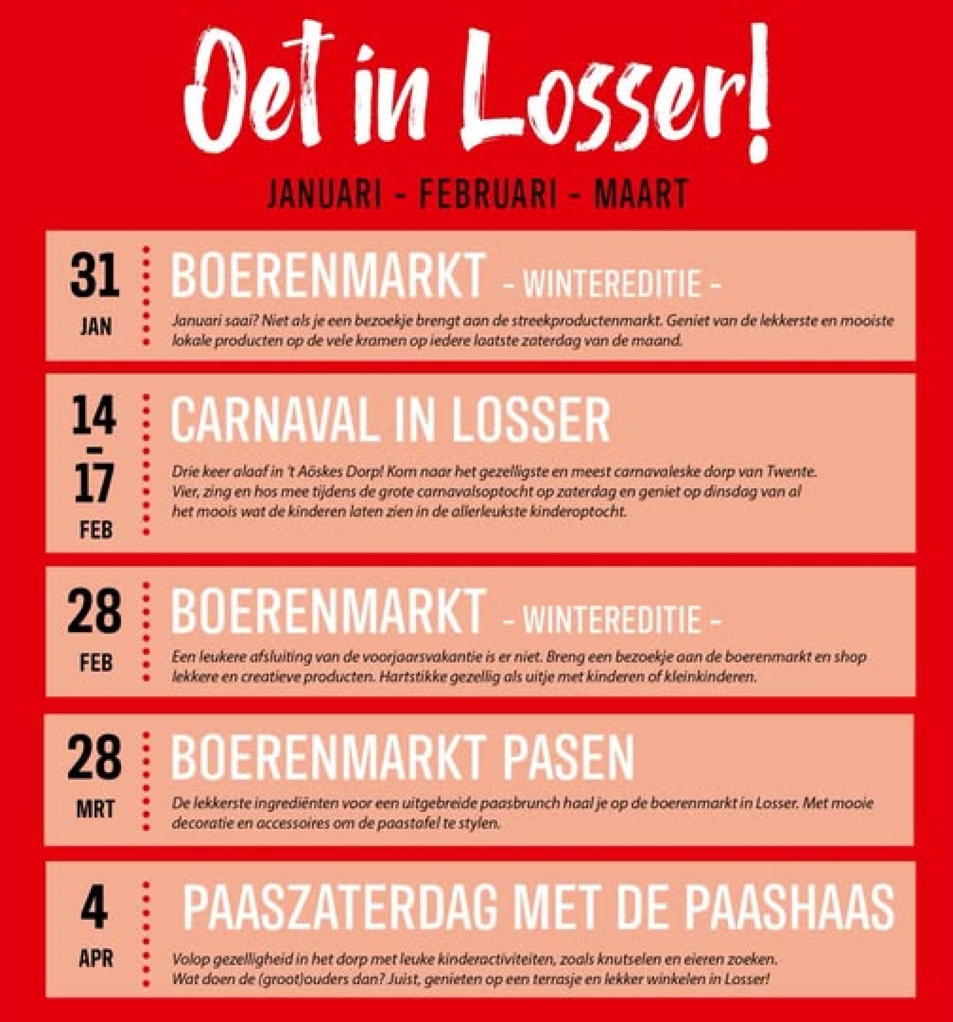 Heerlijke streekproducten proeven en kopen. Dat kan het hele jaar iedere laatste zaterdag van de maand in het gezellige centrum van Losser.