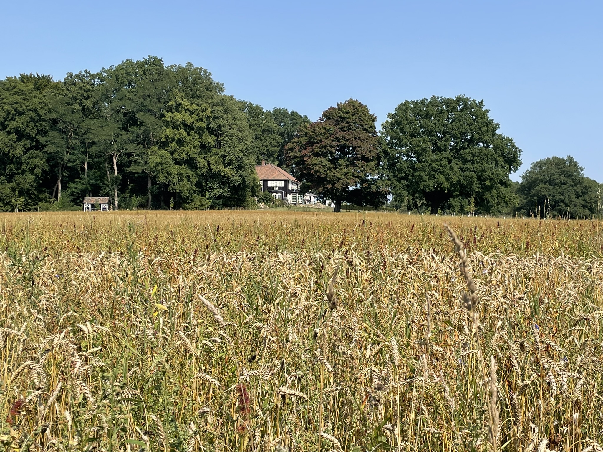 Bovenop de Hakenberg staat een smaakvolle, chaletachtige zwarthouten villa, ooit gebouwd door Textielfabrikant Blijdenstein (ja hoor, vroeger was hier het geld …..). Hiervan vang je een glimp op halverwege het smalle paadje na het witte hek. Op de akker er naast groeit winterrogge, een oud cultuurgewas, helemaal bio.