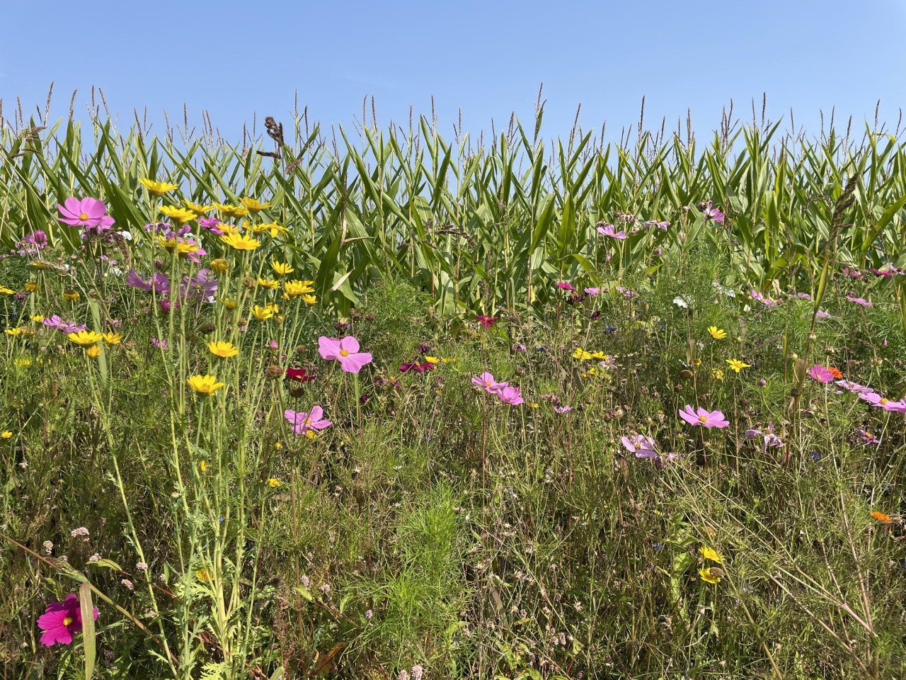 De Schoolweg ligt nu tussen een haag van mais; jammer dat er geen bloemenrand is, want insecten houden ook van een ‘buffetje’ onderweg en wij van een mooi plaatje!