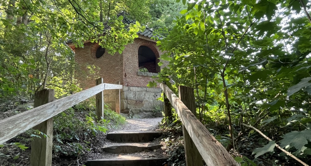 Het paadje eindigt bij de Mariakapel, dat bekend is geworden door de Twentse soapserie ‘Van Jonge Leu en Oale Groond’. Perfect plekje om onze boterhammen uit te pakken. Zonder camera’s, maar wel met uitzicht.