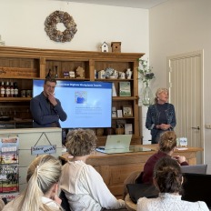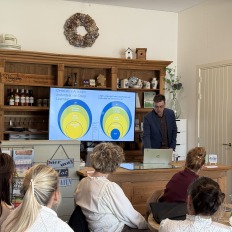 In de middag vertrokken we naar ’t Keampke. Hier kregen we eerst een kijkje in de accommodatie ’t Keampke Buiten, waarna we gastvrij werden ontvangen door Margret, Henri en hun zoon Cas. Margret en Cas namen ons mee in een inspirerende presentatie over het verleden, de ontwikkeling en de toekomstplannen van ’t Keampke, een verhaal vol passie en ondernemerschap.