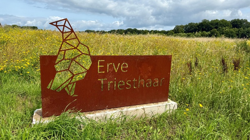Nicole en Maarten hebben Erve Triesthaar sinds 2017 in bezit en met veel aandacht voor de natuur ontwikkeld. Het landgoed is ruim 6 Ha groot met een menging van bosgrond, akkerland en grasland. Afwisselend wordt winterrogge en gerst ingezaaid en als wisselgewas bijv. mosterd. Langs de akkers zijn kruidenrijke akkerranden gerealiseerd. Deze akkerranden dienen als broed, schuil- en foerageergebied voor akkervogels, zoals de Grauwe Kiekendief, Veldleeuwerik en Patrijs en natuurlijk ook voor insecten. Triesthaar is een verbastering van (Pa)trieshaan, dus Patrijs; reden waarom de Patrijs uitgewerkt hebben in het logo. In 2023 is in het kader van de aktie Iedereen een Boom een groot aantal bomen aangeplant, waaronder Gladde Iep, Peer, Walnoot, Winterlinde en Kastanje.