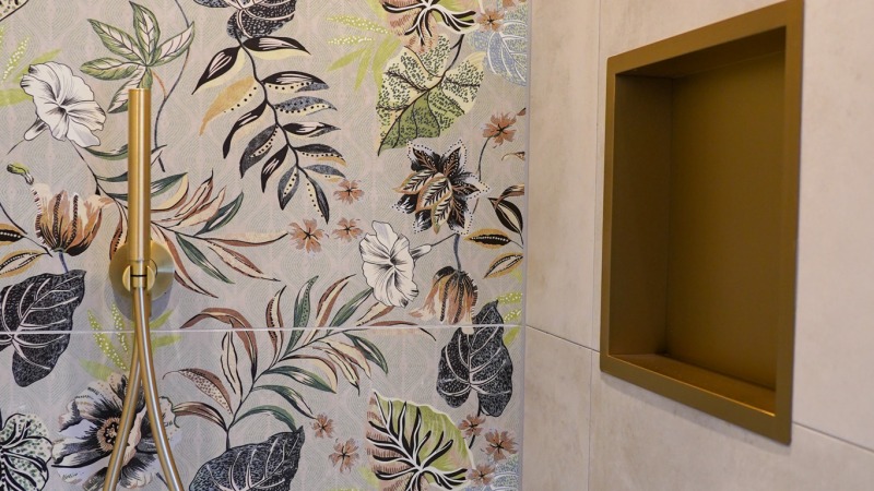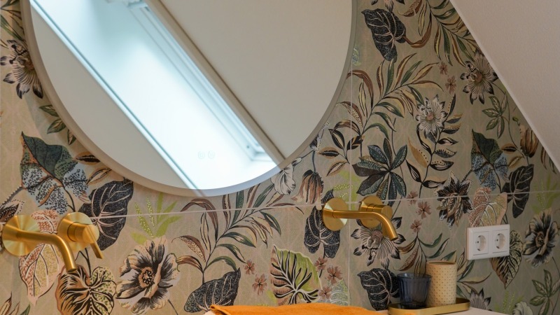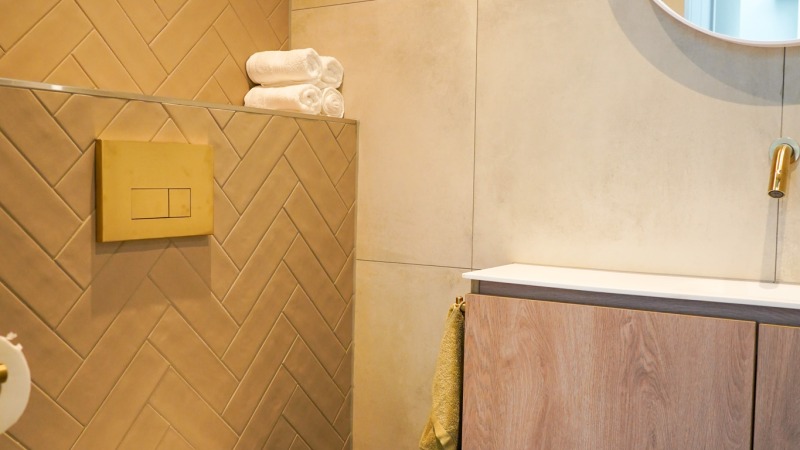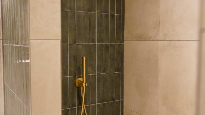 - Badkamer met regendouche, handdouche en wastafel met 2 inbouwkranen