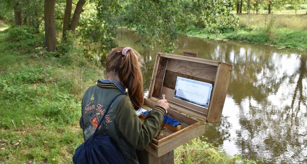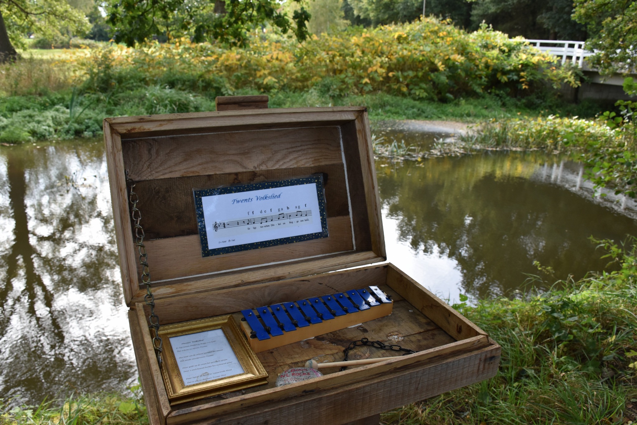 We vervolgen het pad en lopen langs een grote houten kist. We maken de kist open en worden uitgenodigd om het Twents volkslied op de xylofoon te spelen. We testen ons muzikaal talent uit op de xylofoon met wisselend succes. Na even oefenen rolt er toch een mooi deuntje uit!