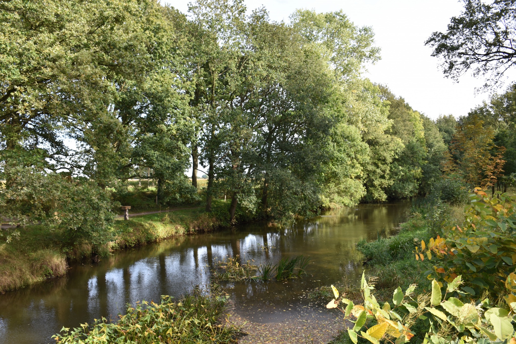 Met onze wandelschoenen stappen we door de gevallen eikels en zien we verschillende paddenstoelen. Het laaghangende herfstzonnetje geeft de Dinkel een mooie gloed. Wat geeft dat een herfstig gevoel!